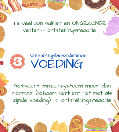 O.a. (een te veel aan) geraffineerde suiker doet dit 1) omdat de bloedsuikerspiegel te hoog wordt/blijft, waardoor vaten beschadigen => ontstekingen. 2) omdat een te veel aan suiker wordt opgeslagen als wit vet => ontstekingen.