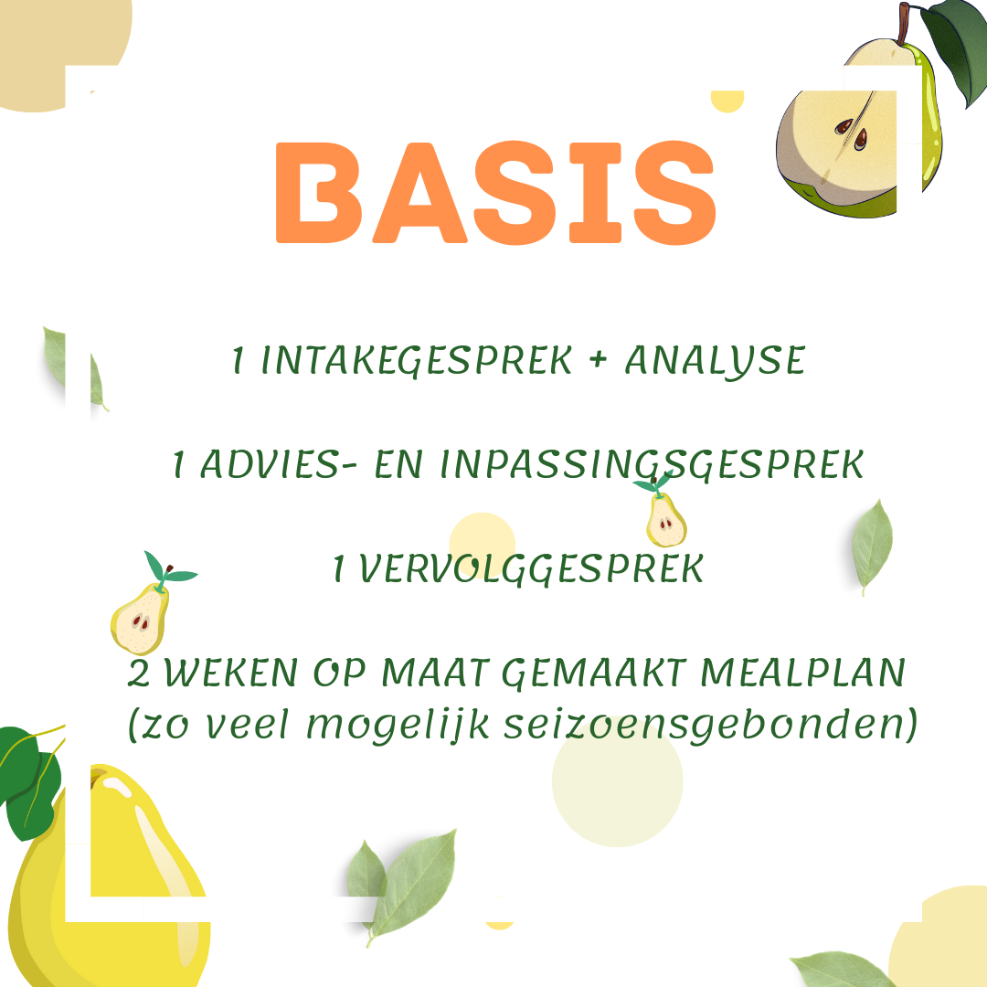 Ik kijk hierbij ernaar of je voor jouw leeftijd en hoeveelheid lichaamsbeweging genoeg vochttoevoegend drinkt, of je genoeg eiwitten, vezels, groenten/fruit, gezonde vetten tot je neemt en andere belangrijke voedingsmiddelen, of je een gebalanceerde maaltijdsamenstelling hebt en of er wellicht betere productkeuzes zijn. Je ontvangt aan de hand van de analyse advies en tips waarmee je zelf aan de slag kan. Naar leefstijl wordt hierbij niet uitgebreid gekeken. Deze dienst is voor jong en oud.