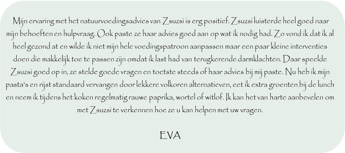 Met mijn diensten en producten probeer ik zoveel mogelijk mensen de kans te bieden om met (natuur)voedingsadvies en aanvullende levensstijladviezen aan de slag te gaan. Zo hoop ik dat iedereen wat vindt dat bij hem/haar past, of je al dan niet gebonden bent aan een kleine portemonnee. Je doet jezelf, je kind, je hele gezin dit sowieso cadeau.